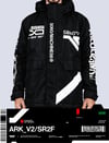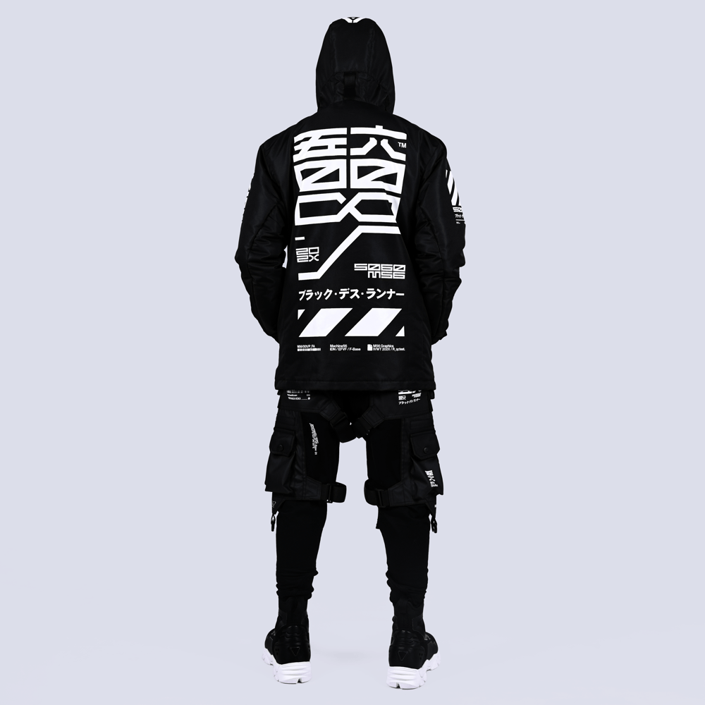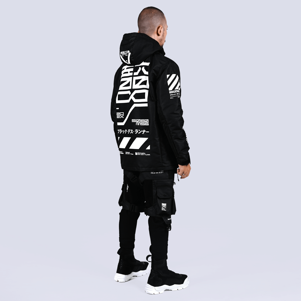 Upgraded fit of ARK_V1 series in black color. Medium frame coat style jacket.
