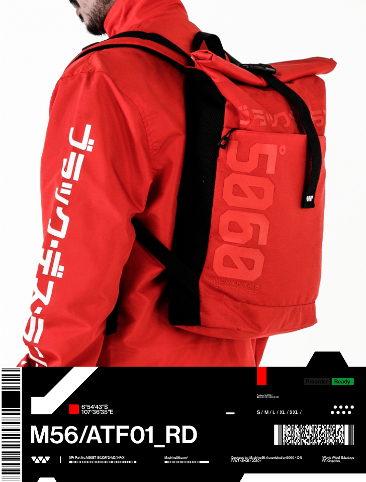 Mesh back layer with details. Rolltop function. M56 engraved plastic buckle and zip compartment on the sides. Inner zip pocket for valuables. High quality rubber screen prints.